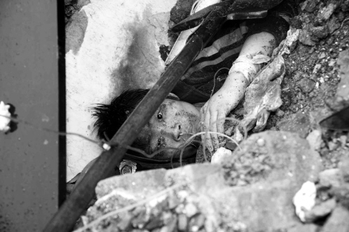 一位被困在廢墟中的孩子經(jīng)過(guò)緊急救助后等待救援