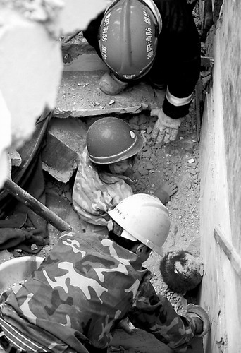 消防戰(zhàn)士在四川綿竹搜救幸存的學(xué)生
