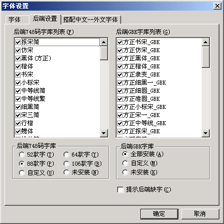 后端設(shè)置:用于控制后端發(fā)排時如何處理字體。首先需要選擇后端是否購買了GBK字庫,若設(shè)置安裝,飛騰在發(fā)排時會將字體列表中的“方正中文”或“GBK字”自動對映到GBK發(fā)排字中;若選擇未安裝,飛騰在發(fā)排時會將字體列表中的“方正中文”字對映到以前的748/GB發(fā)排字庫,而字體列表中的GBK字將會發(fā)排出錯。 若選擇后端未安裝GBK字庫,則需要選擇后端購買了哪種748碼發(fā)排字庫。建議選擇“提示后端缺字”,發(fā)排生成PS文件時飛騰會對不在后端發(fā)排字庫列表中的字體報錯提示。