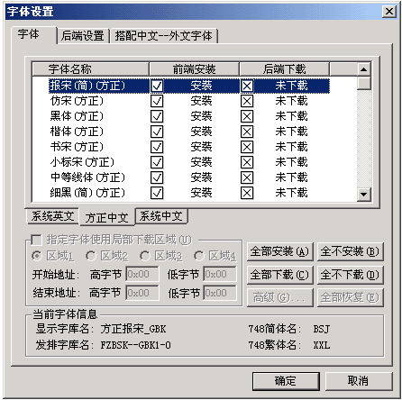 注意:不要使用“全部安裝”或“全不安裝”按鈕。 在方正中文頁,根據(jù)需要設(shè)置相關(guān)字體。 ·前端安裝是指在飛騰組版的字體號列表中將要顯示的字體。需要根據(jù)用戶所購買的字體款數(shù)設(shè)置,將未購買的字庫除去。 ·后端下載是指飛騰在發(fā)排PS文件時直接包含前端顯示字,以代替后端字庫。對于后端未購買或三方廠商的字庫,均可以選擇該種方式。但是,下載的字體精度可能會很差。 注意:下載的字體必須安裝了前端顯示字庫。 ·目前方正蘭亭字有52/64/88/106款字,但是“方正中文”頁列出的北碑、金隸兩款字不在106款字庫中,請將其除去。其它字體,請根據(jù)用戶購買情況選擇。 ·“系統(tǒng)英文”所列字體建議全不安裝,若選擇安裝,必須在后端NTRIP上的重置字體中設(shè)置使用系統(tǒng)字。 ·“系統(tǒng)中文”所列字體為安裝到本機的蘭亭字庫。若后端未購買GBK字庫,建議將所有GBK字體除去;或選擇安裝、下載(必須安裝了46款GBK顯示字庫)。后端購買了GBK字庫的也建議全部除去,以“方正中文”作為唯一字體列表中使用的字體。