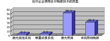 采用直接制版技術(shù)就必須使工作流程數(shù)字化,但現(xiàn)在的數(shù)字化工作流程還不夠成熟,大部分的絲印企業(yè)還處于觀望狀態(tài)。在調(diào)查結(jié)果中,52.23%的企業(yè)采用激光照排,30.8%的企業(yè)采用傳統(tǒng)照相制版(如下圖所示)。