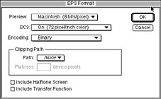 解方:在將圖像存為EPS格式時,小心不要選擇帶加網(wǎng)信息。同時還要注意其他的選項。