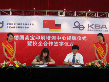 2007年5月25日,德國高寶印刷培訓(xùn)中心揭牌儀式暨校企合作儀式在安徽新聞出版職業(yè)技術(shù)學(xué)院隆重召開。安徽省新聞出版局助理巡視員盛大全先生、德國高寶公司亞太銷售總經(jīng)理海杜克先生、安徽新聞出版職業(yè)技術(shù)學(xué)院程德和院長、德國高寶大中華區(qū)首席代表岑寒先生、安徽省印刷協(xié)會王德明秘書長、安徽新聞出版局印刷處胡文生處長、安徽新聞出版職業(yè)技術(shù)學(xué)院吳鵬副院長等領(lǐng)導(dǎo)以及印刷業(yè)的同仁和新聞媒體的朋友們共同出席了此次活動。