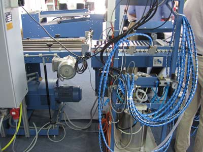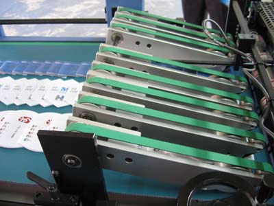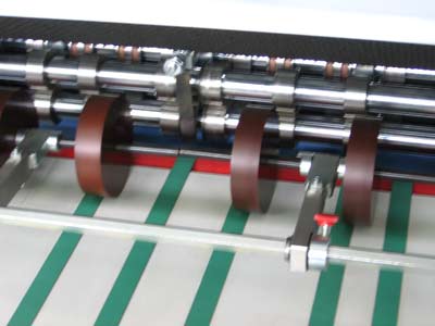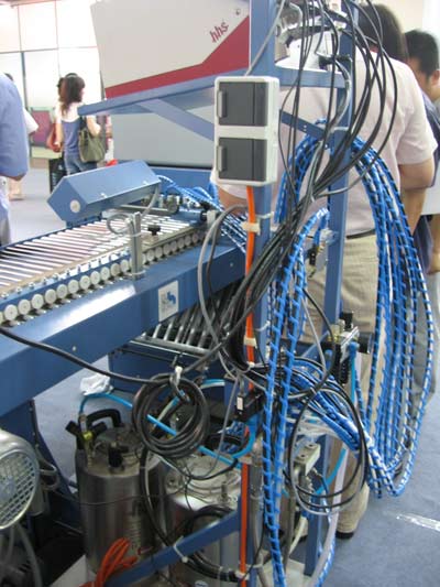 圖為M7多柵欄自動(dòng)折頁(yè)機(jī)的冷膠容器及噴槍線(圖3),折輥(圖1)、凹槽用來(lái)上膠位置(圖4噴槍與折頁(yè)機(jī)連接處)。根據(jù)與MBO合作的、也正伺機(jī)進(jìn)入中國(guó)市場(chǎng)的以噴膠系統(tǒng)(包括熱膠及冷膠)、質(zhì)量檢測(cè)系統(tǒng)為主營(yíng)業(yè)務(wù)的Banumer hhs技術(shù)人員介紹,KL112多柵欄微型折頁(yè)機(jī)可以同時(shí)接8個(gè)噴頭,它以噴在折頁(yè)的8個(gè)焦點(diǎn),且焦點(diǎn)間距可以自動(dòng)化設(shè)備調(diào)節(jié)。在噴膠時(shí)為防止膠被外粘,設(shè)置時(shí)切忌噴點(diǎn)間緊無(wú)間隙。而據(jù)介紹國(guó)內(nèi)設(shè)備常采用滾膠輪,只噴一點(diǎn)。冷膠系由50%膠及50%水于配比,靠水揮發(fā),產(chǎn)生冷膠粒后被打到噴槍里。