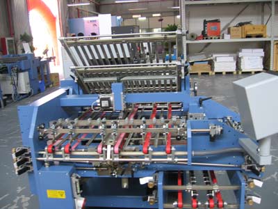 圖為KL112多柵欄微型折頁(yè)機(jī)的收紙。MBO資料顯示:KL112適用于高難度大批量的折頁(yè)任務(wù)。有關(guān)紙張尺寸及速度參數(shù)如下:連續(xù)式吸紙飛達(dá)紙張尺寸,最大mm為350*500/600(最小mm:40*50)、450*500/600(最小mm:40*50);速度為35-150m/min。MBO資料介紹:此款設(shè)備原為海格海曼(H+H),冷膠裝置也成為其增值中心,尤適用于彩票、各類小冊(cè)子及雙聯(lián)產(chǎn)品。