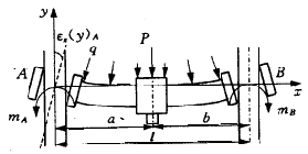 在高速測量中,由于分布質(zhì)量產(chǎn)生的慣性力將使橫梁發(fā)生彎曲變形,而A、B的氣浮導軌也具有一定的剛度,使x-滑架相對于導軌也產(chǎn)生一定的偏轉。這樣,在A、B將有附加的力矩mA、mB作用,橫梁發(fā)生的是復雜變形。