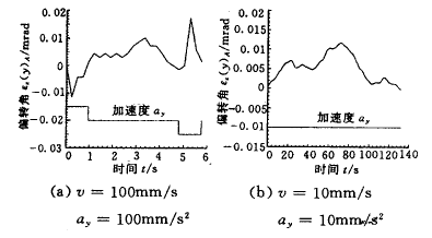 對比圖5a和圖5b的結果,我們可以看出,起動和減速階段的慣性力造成了滑架的偏轉。這一偏轉量將導致測頭位置處的位移誤差。同樣,由于導軌面的平面度也可導致滑架的偏轉,從而引起測頭位置處的位移誤差。在本實驗中,由于導軌面的平面度導致滑架的最大偏轉為0.012 mrad,最大動態(tài)偏轉誤差為0.018 mrad。