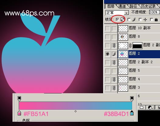 2.打開素材2,用魔術(shù)棒勾出來,拖進(jìn)來放好位置,然后鎖定圖層,選用漸變工具繪制漸變,顏色設(shè)置及效果如圖2
