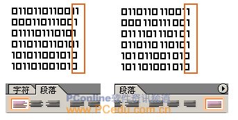 如果希望最后的圖像效果更清晰一些,那么要對(duì)文字保留鋸齒效果,也就是將消除鋸齒方式設(shè)為無(wú)。在這里,我使用了一種像素字體,將字體設(shè)為該種字體最合適的大小,在字符屬性面板中,將自動(dòng)行距適當(dāng)減小。有時(shí)候,圖案中過(guò)高的行距可能會(huì)造成最終圖像中部分細(xì)節(jié)缺失。如果發(fā)現(xiàn)文本右端無(wú)法對(duì)齊(這種情況和所用字體有關(guān)),可以打開(kāi)段落屬性面板,將文本對(duì)齊方式選擇為全部對(duì)齊,這樣文本框內(nèi)的文字便能滿(mǎn)足圖案的要求了。