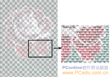 1.首先,我們先來(lái)制作用以填充的圖案。打開(kāi)Photoshop,新建一個(gè)文檔,100×100像素即可,背景為透明。在新文檔的圖層1中,用文本工具拖出一個(gè)大致為正方形的文本框,將文本顏色設(shè)為黑色,設(shè)定好字體屬性后,用0和1填滿(mǎn)文本框。需要的話(huà),打開(kāi)字符屬性欄,調(diào)整行距。