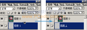 5.現(xiàn)在調(diào)整圖層順序,將圖層0置于圖層1之上,按住Alt鍵,將鼠標(biāo)移動(dòng)到圖層面板上兩個(gè)圖層之間的分隔線(xiàn)上,指針變?yōu)榫幗M符號(hào),點(diǎn)擊分隔線(xiàn),即將圖層編組。這時(shí),圖像應(yīng)如圖06a所示。