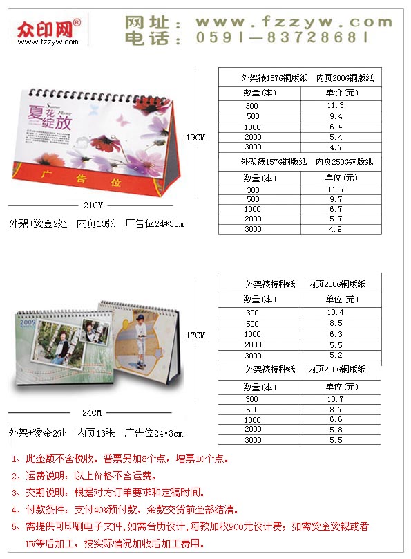 臺歷現(xiàn)在有桌面臺歷和電子臺歷,眾印網(wǎng)生產(chǎn)的主要品種有各種商務(wù)臺歷、橫版臺歷、紙架臺歷、水晶臺歷、記事臺歷、便簽式臺歷、禮品臺歷、個性臺歷等。 在這主要為大家介紹兩款橫版臺歷:分別為21cm*19cm、24*17cm,這兩款掛歷有三角形外架,可在上面印刷自己產(chǎn)品廣告,廣告為面積為24*3cm。因臺歷價格與產(chǎn)品數(shù)量有直接關(guān)系,所以眾印網(wǎng)為大家提供了幾種數(shù)量的價格供大家參考: 21cm*19cm這款臺歷印刷外架裱157g銅版紙,內(nèi)頁200g銅版紙 21cm*19cm這款臺歷印刷外架裱157g銅版紙,內(nèi)頁250g銅版紙 24cm*17cm這款臺歷印刷外架裱特種紙紙,內(nèi)頁200g銅版紙 24cm*17cm這款臺歷印刷外架裱特種紙紙,內(nèi)頁250g銅版紙