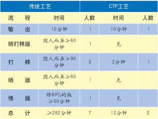 CTP技術(shù)簡(jiǎn)化了曬版等工藝流程,減少了印前準(zhǔn)備時(shí)間和所需人力,從而節(jié)省了圖書(shū)印制所需要的時(shí)間。根據(jù)西安煤航地圖制印公司印前部的統(tǒng)計(jì),以1套對(duì)開(kāi)四色版為基準(zhǔn),使用CTP技術(shù)后所節(jié)省的時(shí)間和人力相當(dāng)明顯,如表1所示。很多已經(jīng)引進(jìn)CTP技術(shù)的印刷企業(yè),對(duì)這一點(diǎn)也都比較認(rèn)同。