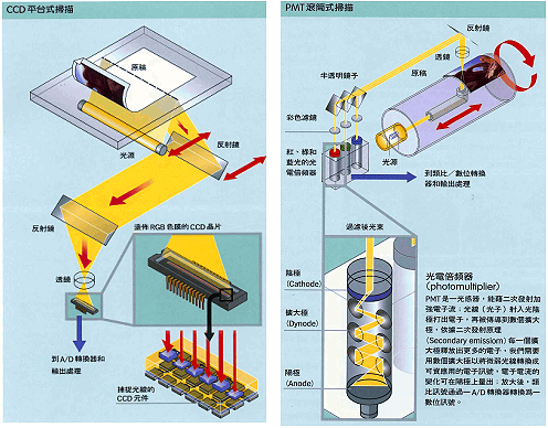 它分為兩大類:平臺掃描機和滾筒掃描機,平臺掃描機上稿平臺為平面,結(jié)構(gòu)緊湊,采用CCD(電荷耦合器件)作為感光元件;滾筒掃描機上稿平臺為柱形,結(jié)構(gòu)復雜,采用PMT(光電倍增管)作為感光元件。
