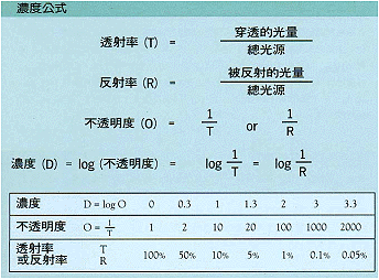 對于紙,由反射材料反射的光越少,密度越高;對于軟片,由透射材料透過的光越少,密度值越高,紙的密度范圍約是0.0D到2.0D,軟片的密度范圍約為0.2D到4D。