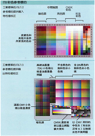 工業(yè)標準色彩參考目標色卡,用以校準輸入和輸出裝置。IT8的作用就好像是量度色準的尺,只要將掃描完成后的IT8在顯示器及輸出系統(tǒng)跟IT8原稿作出比較,就可得知色差的程度。