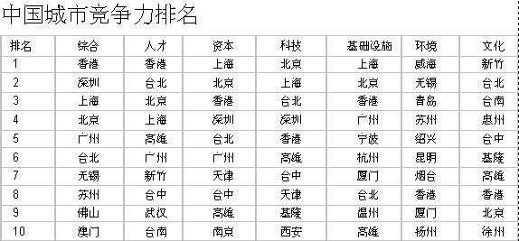 根據(jù)《全球城市競(jìng)爭(zhēng)力報(bào)告(2005-2006)》發(fā)布的全球110個(gè)城市綜合力排名,進(jìn)入榜單的中國(guó)城市共有22個(gè),但主要是位于70-100名之間。其中香港排名是19位;其次是臺(tái)北,48位;內(nèi)地排名最高的是上海,第69位;接下來是北京、深圳、廣州等。