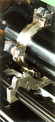 為了解決中小幅面印刷品經(jīng)大幅面膠印機(jī)印刷后仍需離線進(jìn)行分切的難題,曼羅蘭、高寶等公司紛紛推出了在線分切裝置,一般安裝在最后一個(gè)機(jī)組的壓印滾筒上。曼羅蘭的在線分切裝置,自身有驅(qū)動(dòng)部件;高寶的在線分切裝置,裁切刀對(duì)壓印滾筒的壓力由氣壓控制。